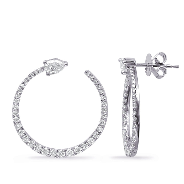 This Earring is available in 14K White Gold. There are a total of 74 stones. There are Pear Shape with a total carat weight of 0.5 set in a Prong Set setting. There are Rounds stones with a total carat weight of 1.03 set in a Prong Set setting.