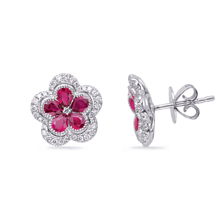 This Earring is available in 14K White Gold. There are a total of 82 stones. There are Rounds with a total carat weight of 0.33 set in a setting. There are Ruby stones with a total carat weight of 1.78 set in a setting.
