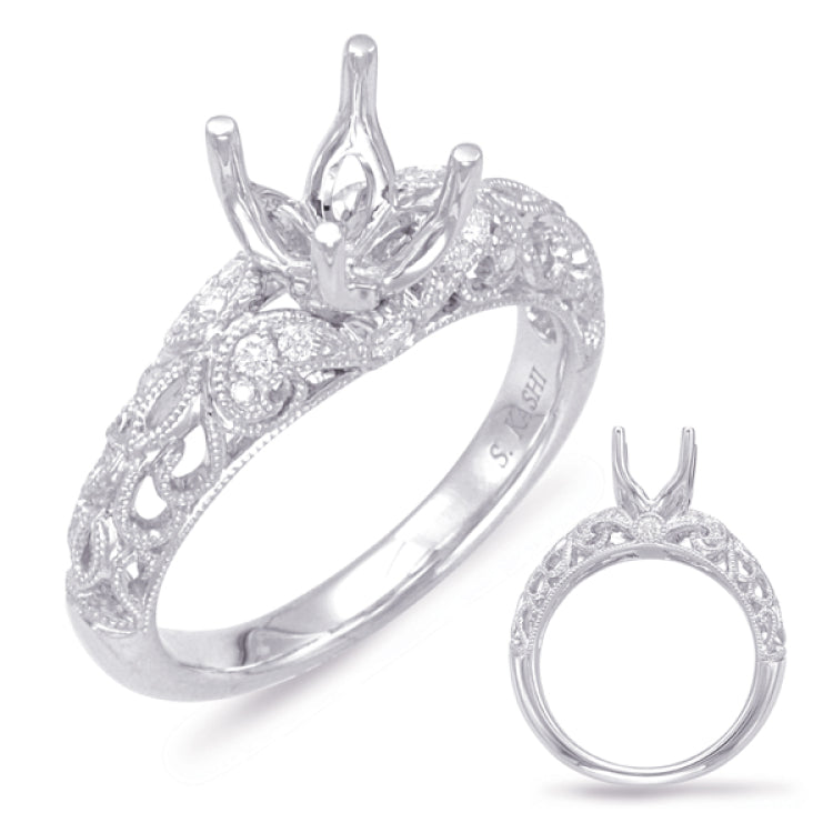 This engagement ring is available in 14K White Gold. There are a total of 14 stones. There are Rounds with a total carat weight of 0.14 set in a Bezel Set|Micro Pave setting.