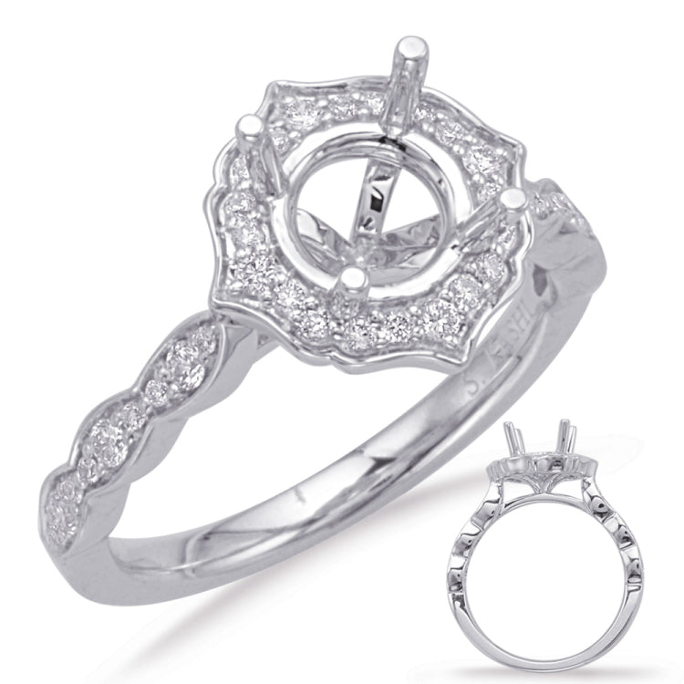 This engagement ring is available in 14K White Gold. There are a total of 38 stones. There are Rounds with a total carat weight of 0.26 set in a Micro Prong|Shared Prongs setting.
