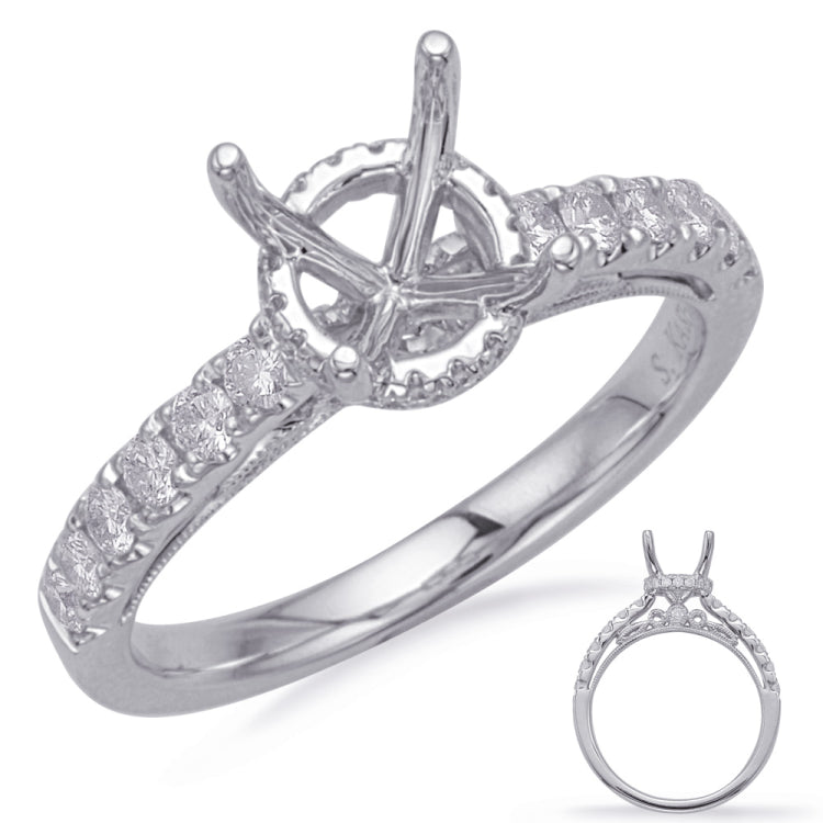 This engagement ring is available in 14K White Gold. There are a total of 32 stones. There are Rounds with a total carat weight of 0.4 set in a Bezel Set|Micro Prong setting.