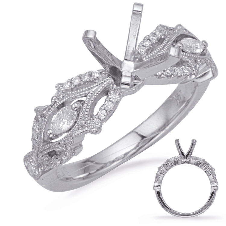 This engagement ring is available in 14K White Gold. There are a total of 44 stones. There are Marquise with a total carat weight of 0.16 set in a Bezel Set|Micro Prong|Prong Set setting. There are Rounds stones with a toal carat weight of 0.2 set in a Bezel Set|Micro Prong|Prong Set setting.
