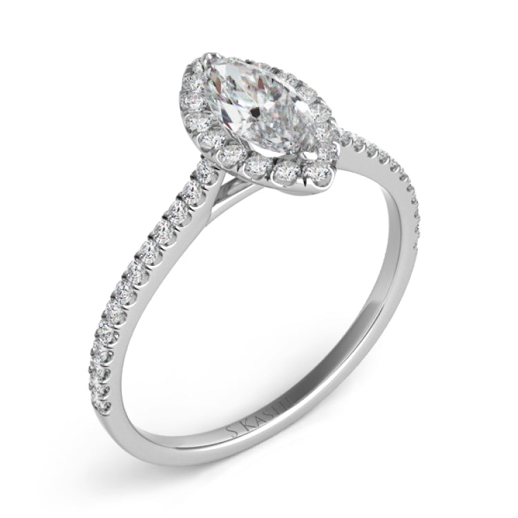 This engagement ring is available in 14K White Gold. There are a total of 38 stones. There are Rounds with a total carat weight of 0.43 set in a Micro Prong setting.