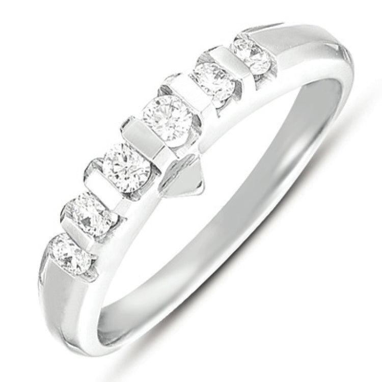 This Band is available in 14K White Gold. There are a total of 6 stones. There are Rounds with a total carat weight of 0.26 set in a setting.
