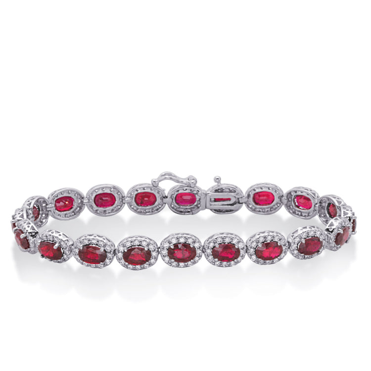 This Bracelet is available in 14K White Gold. There are a total of 300 stones. There are Rounds with a total carat weight of 2.38 set in a setting.There are Ruby stones with a total carat weight of 11.44 set in a .