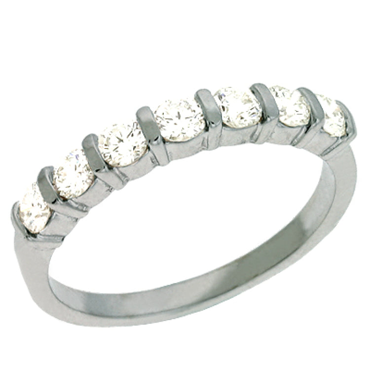 This Band is available in 14K White Gold. There are a total of 7 stones. There are Rounds with a total carat weight of 0.64 set in a setting.There are stones with a total carat weight of 0 set in a .