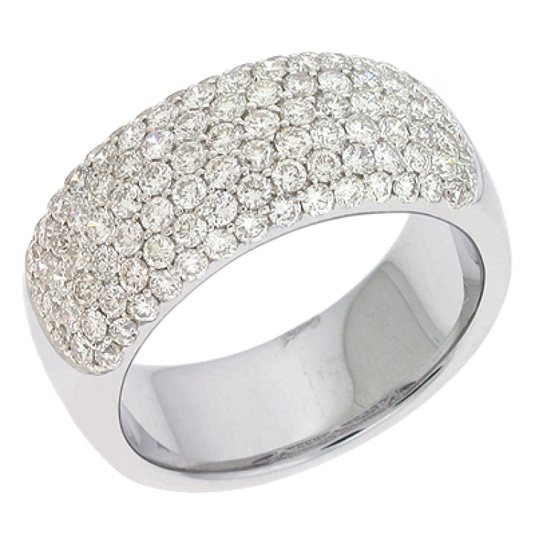 This Band is available in 14K White Gold. There are a total of 105 stones. There are Rounds with a total carat weight of 1.45 set in a Micro Pave setting.
