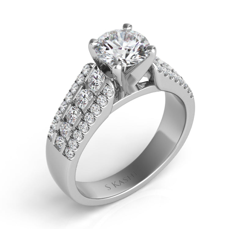 This Engagement ring is available in 14K White Gold. There are a total of 38 stones. There are Rounds with a total carat weight of 0.67 set in a Channel Set|Micro Prong setting.