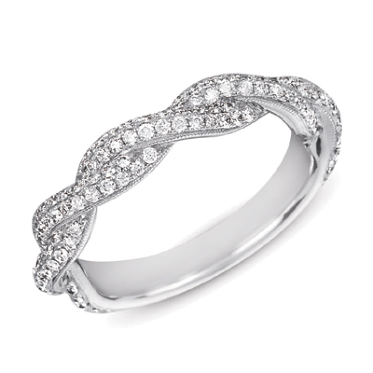 This Band is available in 14K White Gold. There are a total of 137 stones. There are Rounds with a total carat weight of 0.77 set in a Micro Pave setting.