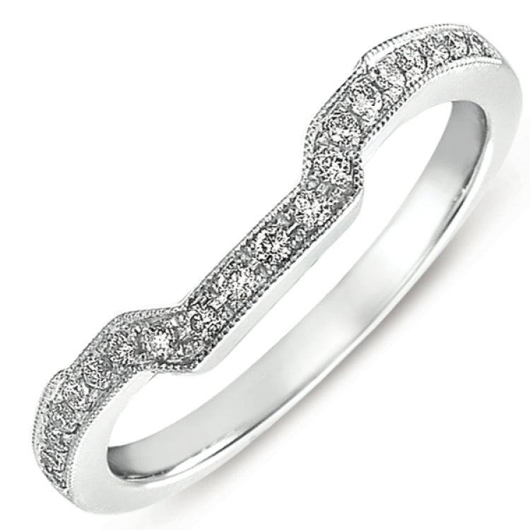 This Band is available in 14K White Gold. There are a total of 20 stones. There are Rounds with a total carat weight of 0.15 set in a setting.