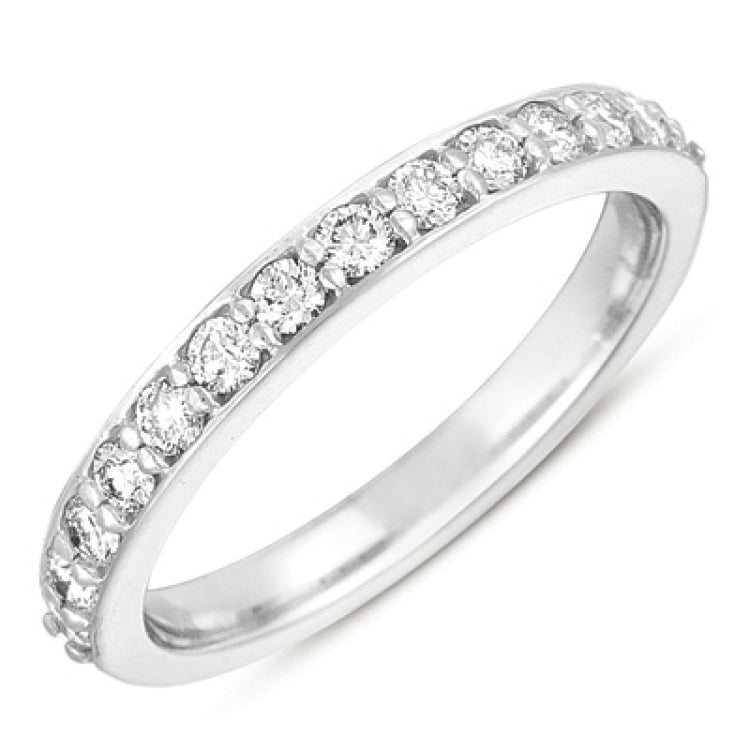 This Band is available in 14K White Gold. There are a total of 14 stones. There are Rounds with a total carat weight of 0.42 set in a Micro Prong setting.