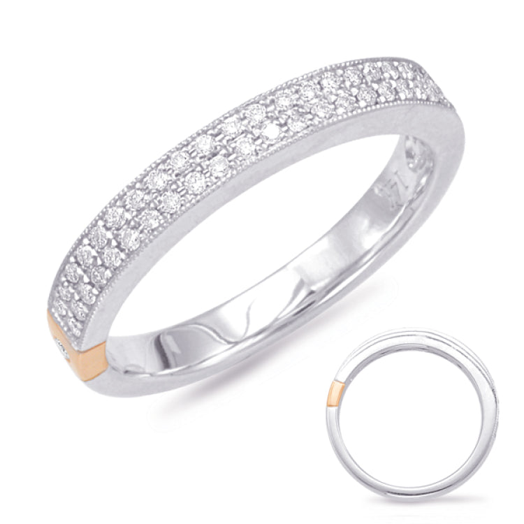 This Band is available in 14K Rose & White Gold. There are a total of 49 stones. There are Rounds with a total carat weight of 0.23 set in a Micro Pave setting.
