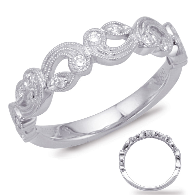 This Band is available in 14K White Gold. There are a total of 14 stones. There are Rounds with a total carat weight of 0.18 set in a Bezel Set|Micro Prong setting.