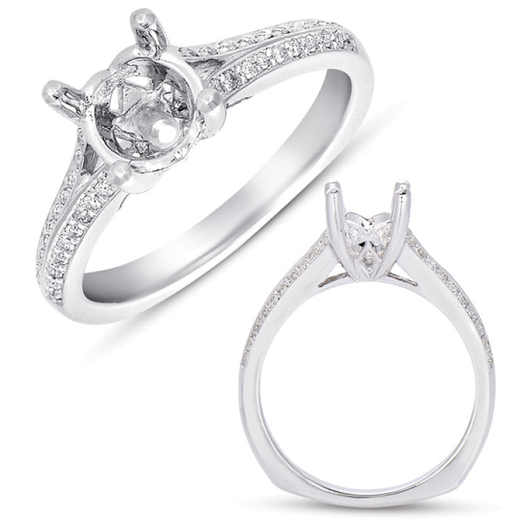 This Engagement ring is available in 14K White Gold. There are a total of 46 stones. There are Rounds with a total carat weight of 0.17 set in a Micro Pave setting.