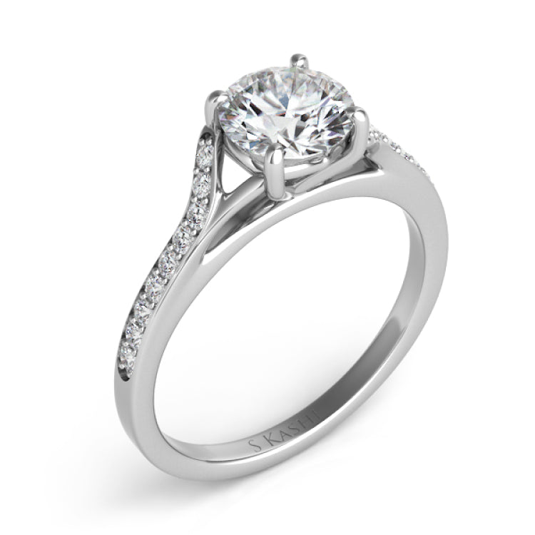 This Engagement ring is available in 14K White Gold. There are a total of 18 stones. There are Rounds with a total carat weight of 0.18 set in a Micro Pave setting.
