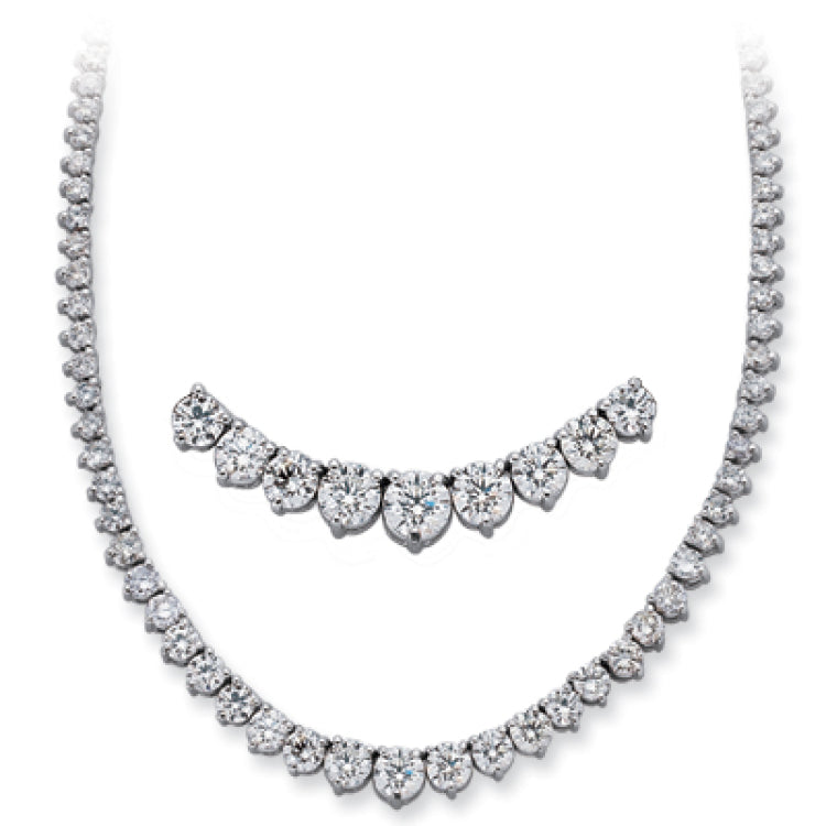 This Necklace is available in 14K White Gold. There are a total of 145 stones. There are Rounds with a total carat weight of 12.01 set in a Prong Set setting.