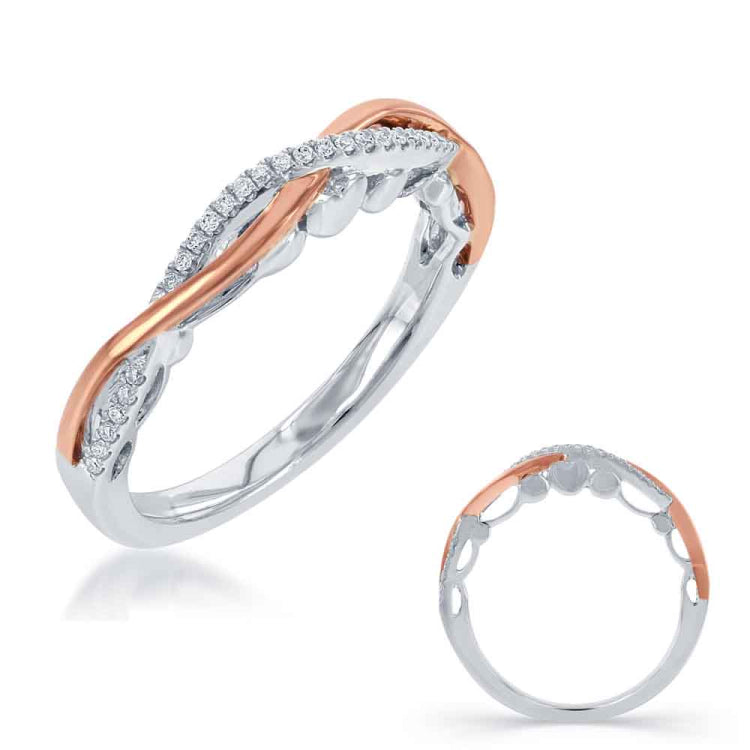 This Band is available in 14K Rose & White Gold. There are a total of 31 stones. There are Rounds with a total carat weight of 0.09 set in a Micro Prong setting.