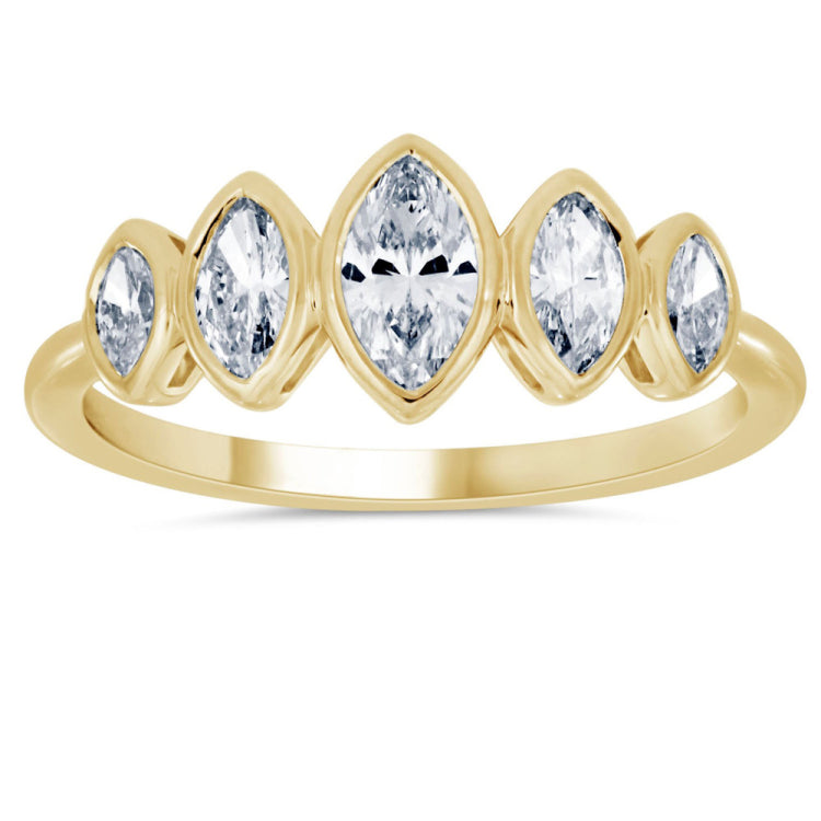 This Fashion ring is available in 14K Yellow Gold. There are a total of 5 stones. There are Marquise with a total carat weight of 0.75 set in a Bezel Set setting.